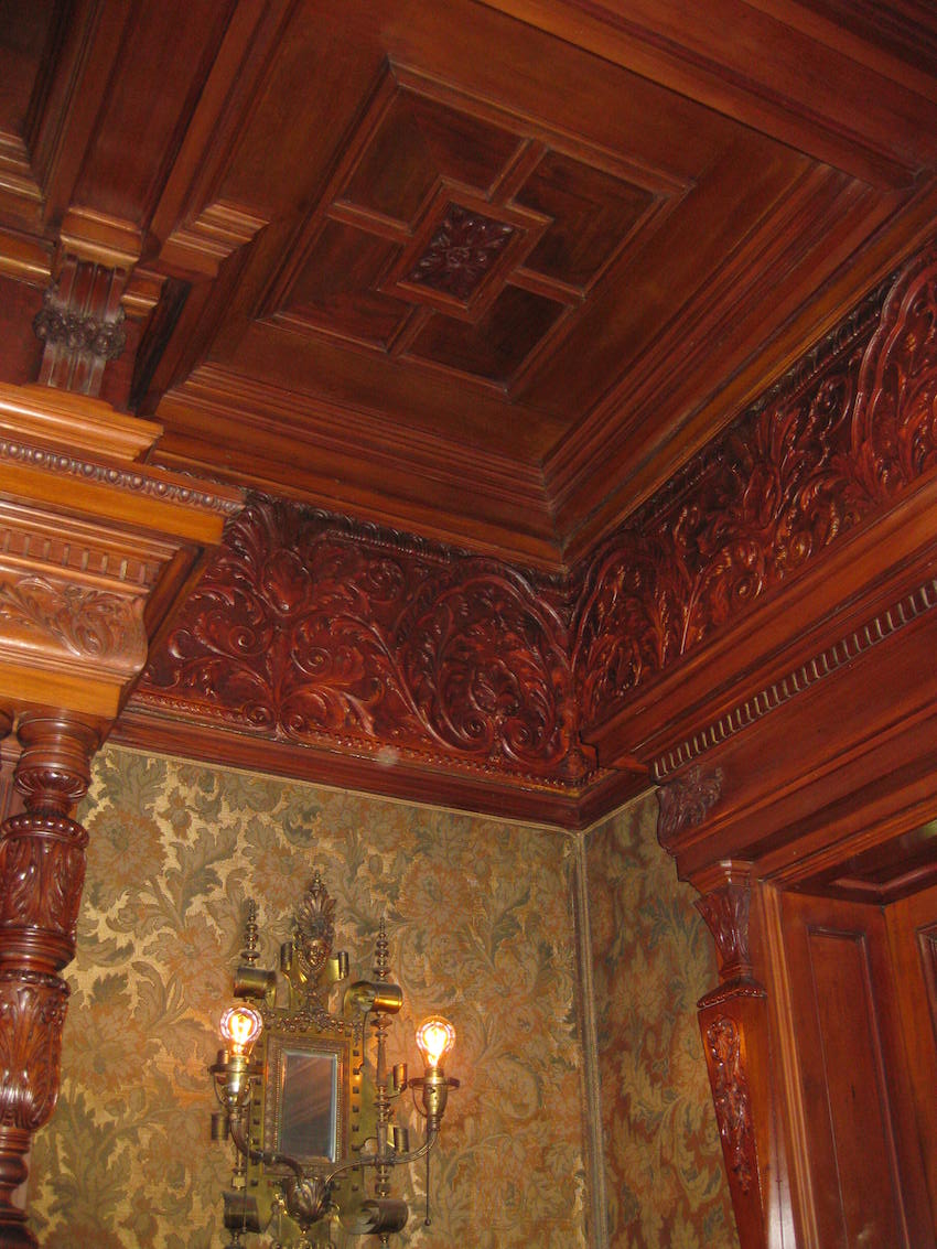 The conservation of the Wilderstein dining room wood paneling and plaster ornament involved dust and soot removal, ailed plaster ornament restoration, and repair of failed wood finishes. The latter were on part of the ceiling and were damaged by a radiator failure. Since the original finish on much of the mahogany panels and ornament was sound, it required cleaning and conservation with a cotton ball moistened with very dilute non-ionic detergent. The plaster required consolidation with an acrylic liquid and inpainting with appropriate brown reversible paints to restore its original color. The ceiling required cleaning and removal of a heavy soot layer followed by application of shellac to moderate the water stain.  Remaining cleaned areas were protected by the application of brown wax.