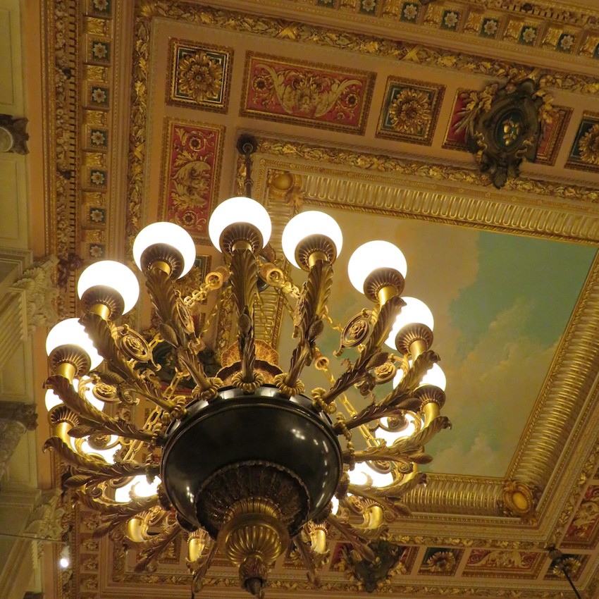 Since their installation in 1895, the chandeliers in the Great Hall had never been taken down. Originally, both wired for electricity and piped for gas, the silk covered wiring used in these lighting fixtures had begun to degrade, resulting in short circuits in several of the lamps. In an effort to keep the gilt bronze surfaces bright, they had been coated with oil, which had built up over the years, trapping dust and darkening the gold significantly.